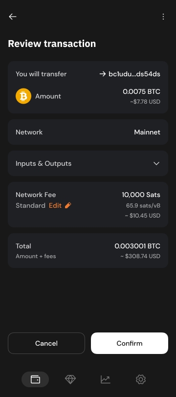 The user will see a Bitcoin transaction signing request prompt in the wallet. Xverse browser extension UI shown as example:
