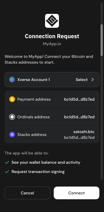 If the user is not connected to your app yet, their Xverse wallet will display a *Connection Request* prompt with: