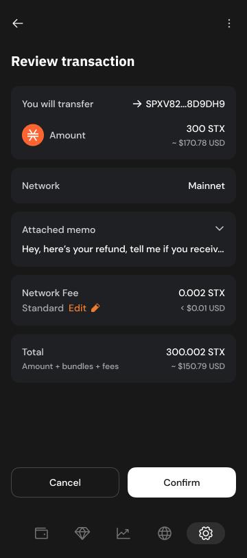 The user will be prompted to review the Stacks transfer transaction in the wallet, with the recipient, memo and amount to send. Xverse browser extension UI shown as example: